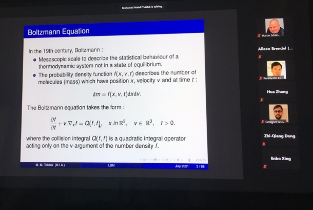 会议交流过程中,李维东副教授在大会上进行了英文的口头报告,报告题目为“Lax-Wendroff Gas Kinetic BGK Scheme for Low-speed Rarefied Gas Flows”。在报告中,对李老师课题组近期在介观数值方法方面的研究成果进行了介绍,并和与会代表在线上进行一些学术讨论和交流。
