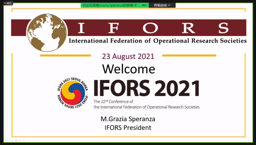 2021年8月23 – 27日,第22届国际运筹学会联合会学术会议(IFORS 2021)在线召开。IFORS自1957年首次在英国举办,每3年举办一次。本次大会由韩国汉阳大学与韩国运筹和管理科学学会联合承办。来自世界各地的二百余位运筹学及相关领域的专家学者出席了开幕式。本届大会包括20多个主题,200多场分会,内容涵盖了运筹学在交通与物流、能源与环境、医疗与公共卫生以及金融、体育等多个领域的理论与应用研究。