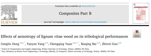 我院船舶摩擦学科研团队合作撰写的学术论文“Effects of anisotropy of lignum vitae wood on its tribological performances”被复合材料领域国际顶级学术期刊《Composites Part B: Engineering》发表。该期刊位于JCR的Q1分区(1/90),中科院1区,影响因子9.078。
