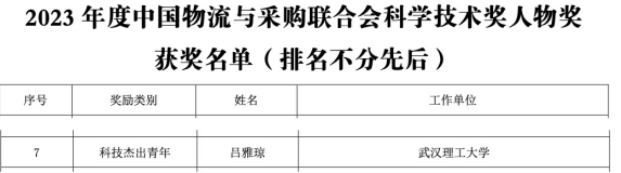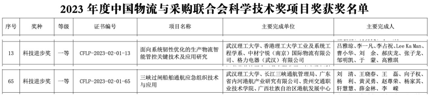 日前,中国物流与采购联合会发布了2023年度科学技术奖获奖通告,经过严格的形式审查、初评、复评和终审环节,我院刘清教授团队“三峡过闸船舶通航应急组织技术与应用”项目与吕雅琼副教授团队“面向系统韧性优化的生产物流智能管控关键技术及应用研究”项目荣获2023年度科技进步一等奖。同时,吕雅琼副教授荣获2023 年度中国物流与采购联合会科学技术奖人物奖--“科技杰出青年”。