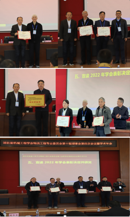 会议宣读了2022年湖北省机械工程学会表彰决定并颁奖。物流工程专业委员会获“先进专业委员会”,湖北科峰智能传动股份有限公司获“特别贡献奖”,肖汉斌教授获“学会特别贡献奖”,我校邵新建和湖北三六重工有限公司周冬青获“学会先进工作者”,湖北佳恒科技股份有限公司金波、武汉港博港机技术有限公司佘黎明、湖北三六重工有限公司赵群、宜都华迅智能输送股份有限公司宋红玖、武汉科技大学王勇、成人影视片 吴洪明、湖北鄂南起重运输机械有限公司李耀成、中国五环工程有限公司魏婷婷获“学会活动积极分子”。