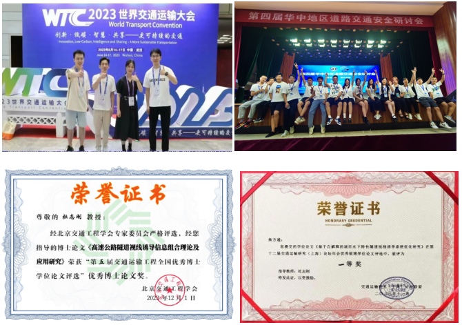 杜老师秉承学术至上、创新包容的原则,鼓励研究生在学术上深入思考、自由探索、大胆创新。他每年都会支持不少于5名研究生参加国内外知名学术会议,如美国TRB会议(3人次)、WTC会议(30多人次)、COTA会议等、全国交通运输领域青年学术会议等,为我们提供了一流的科研环境和众多学术交流的机会,开阔了我们的视野,让我们对交通行业的最新发展有一个更加全面的认识。杜老师始终关注着我们的学业,除了每周的组会,还专门创建了知识分享群,时常给我们分享业内最新的文章及交通工程案例,对我们科研和实践能力的提升产生了潜移默化的影响。此外,杜老师还让学生按季度及学年进行季度总结及学年总结,督导每个研究生的学业进展。在大家的共同努力下,90%以上毕业硕士研究生,都有授权发明专利及核心论文发表,毕业博士生均有10多篇(项)高级别论文见刊(SCI收录论文不小于5篇)、发明专利授权、科技进步奖等成果。这为大家将来的就业与升学打下了良好的基础。