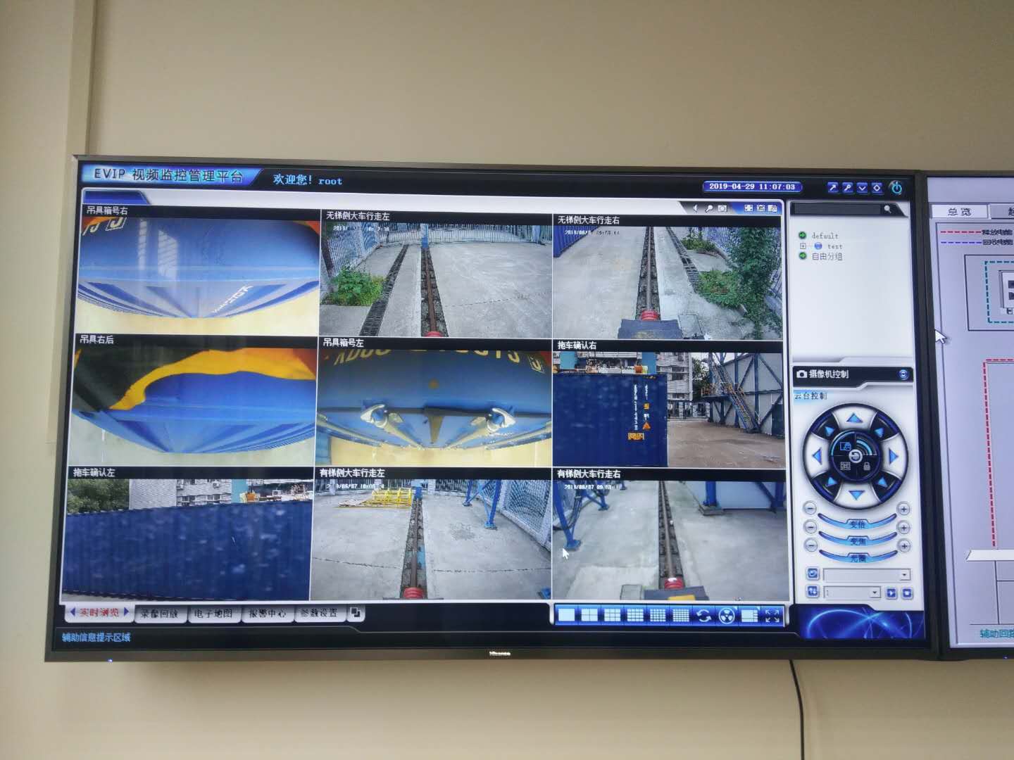 港口装卸设备节能实验平台的跨距为23.47米,跨距内可堆码五列集装箱,并留有一列拖挂车通道;起升高度18.20米,满足标准集装箱堆5过6的要求。平台的类型是包括柴油机、市电以及含储能器件等不同动力电驱动轨道式龙门结构型式具有升降、小车行走和大车行走的综合性实验平台,平台支承在轨道上,并装有行走小车和驾驶室,能在支腿间进行集装箱装卸作业。综合实验平台配备一台可伸缩的单箱集装箱吊具,吊具具备的额定起重量为40.5吨,能够搬运20′、40′的ISO集装箱,可以起吊不同负载和模拟各类作业形式的要求。针对系统中能量管理系统和驱动系统的电力电子装置,配置专门的滤波系统和电气保护系统,保障实验平台的安全。平台的控制使用全数字式PLC控制,采用全数字交流变频驱动器驱动各机构的交流电动机。平台能够沿其正常的车道作直线行走,并具有手动纠偏功能。具备各种安全装置以确保系统的安全运行,并设有包含防撞箱系统、完善的故障显示系统等功能的远程管理系统中心和平台本地监视系统,图2、图3所示。