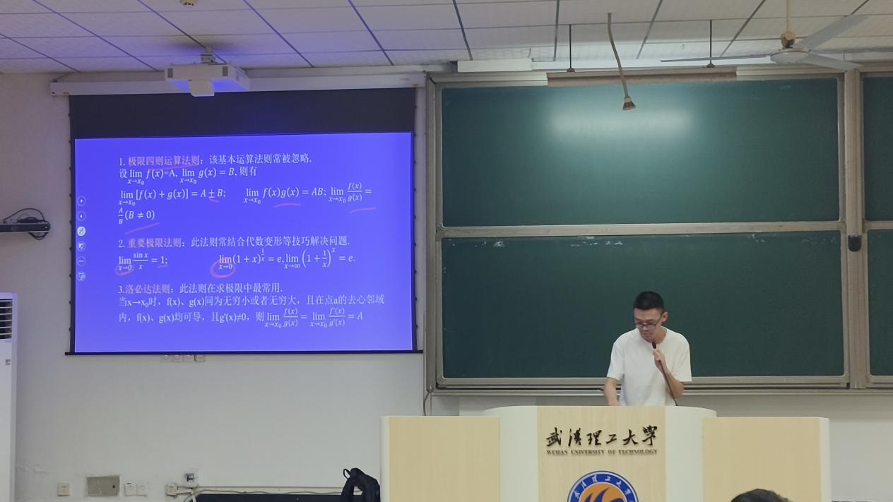 在交流活动上,先锋队成员胥泽宇同学采用“知识点串讲+典型例题讲解”模式展开本次交流。首先回顾知识点,系统的梳理重难点的部分,例如:两个重要极限、等价无穷小的替换、洛必达法则等重要知识点,强调极限思想在后续章节中的桥梁作用。回顾完知识点之后,胥泽宇同学精选了一些典型例题,现场拆解解题思路:针对函数的极限问题,以四个典型例题,示范解题思路和过程;在定积分部分,以换元法和分步法的例题,讲解了该类题型的出题套路;针对多元函数的几何应用,以板书的形式介绍了他独特但便捷的解题方式,在讲解完之后,参与活动的同学们提出问题,积极交流。