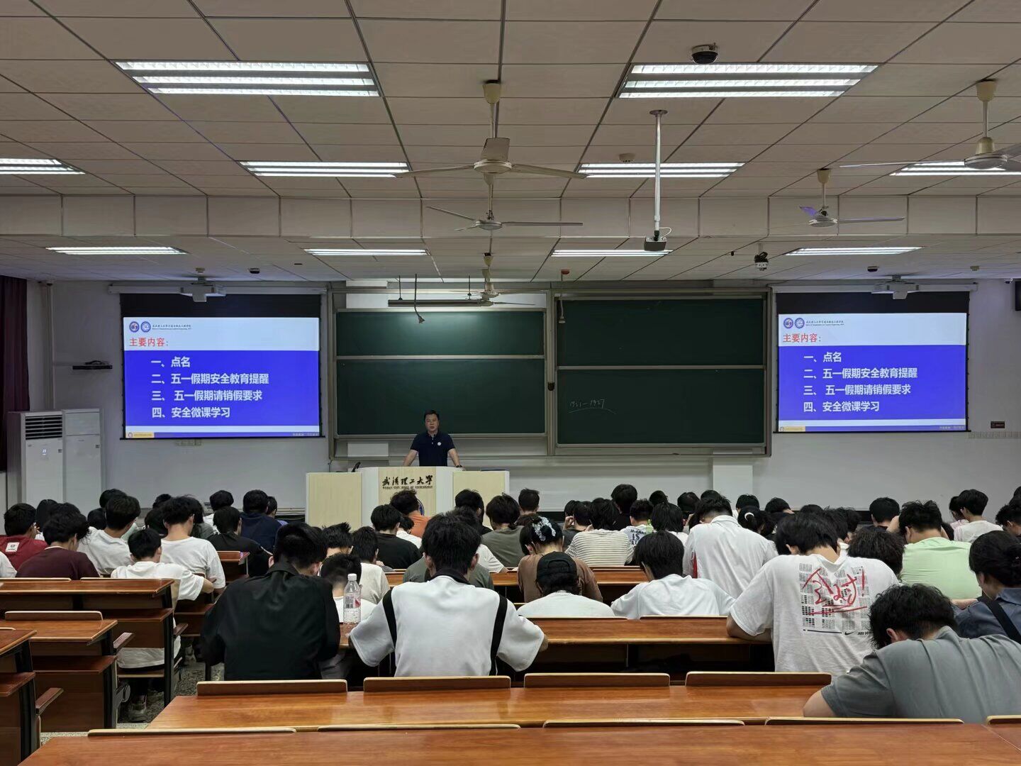 会上,谷进老师从交通安全、财产安全等多个方面对学生进行了宣贯,提醒同学们在假期出行提前规划路线,选择正规交通工具,严格遵守交通规则,杜绝疲劳驾驶与酒后驾车。对于选择外出旅游的同学,注意提前了解目的地天气和安全状况,在景区内遵循指示,不涉足危险区域;对于假期在校的同学,严格遵守校园管理规定,注意宿舍用电安全,外出及时报备去向。