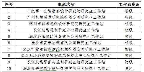 近日,湖北省教育厅发布《省教育厅关于公布2021年湖北省研究生工作站建设名单的通知》(鄂教研函〔2021〕6号),我校10个研究生工作站获批立项建设,其中我院徐良杰老师负责的“中交第二公路勘察设计研究院研究生工作站”及周新聪老师负责的“广州机械科学研究院有限公司研究生工作站”位列其中。