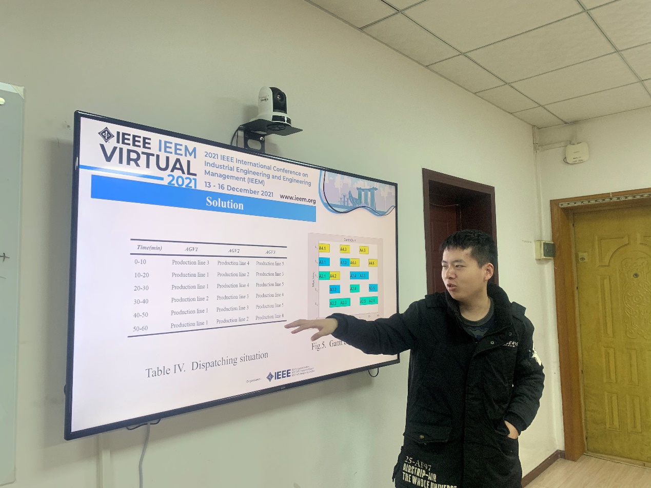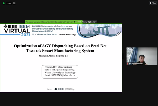 2021年12月15日,我院吕雅琼副教授课题组研究生向尚佳参加国际学术交流会议:工业工程与工程管理国际学术会议IEEE International Conference on Industrial Engineering and Engineering Management 2021(IEEM 2021),在“Systems Modeling and Simulation 1”分论坛针对AGV调度问题的创新研究做了学术汇报。